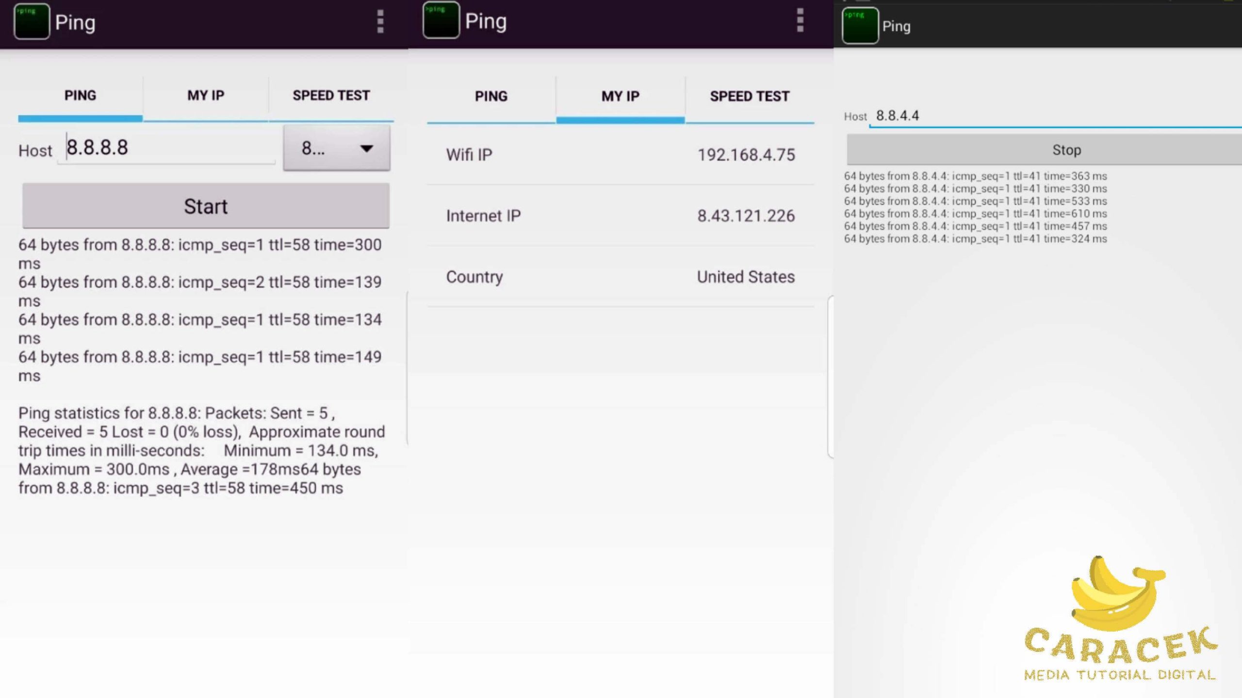 Ada banyak aplikasi penguji ping yang bisa Anda temukan di PlayStore dan bisa Anda pilih sesuai kebutuhan dan review aplikasinya.