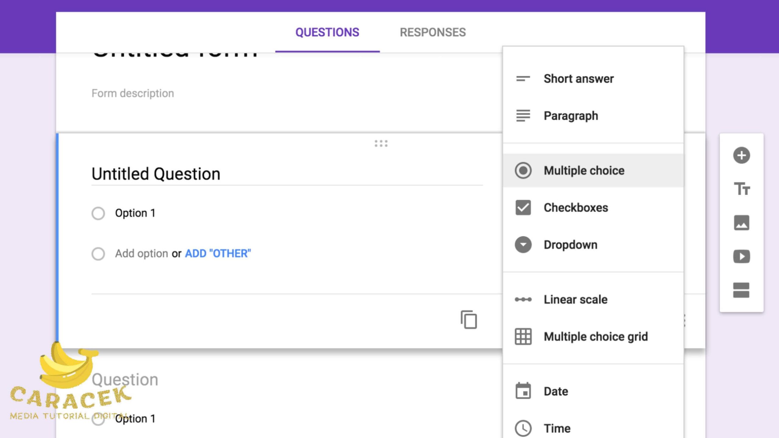 - Lanjutkan dengan menambahkan pertanyaan-pertanyaan yang ingin Anda ajukan dengan klik tombol + (di kanan halaman). Anda dapat memilih jenis pertanyaan yang berbeda, seperti pilihan ganda, kotak centang, teks pendek, teks panjang, dll. Anda juga dapat menambahkan opsi lain, seperti membuat pertanyaan wajib diisi, menambahkan gambar atau video, atau memberi skor pada jawaban