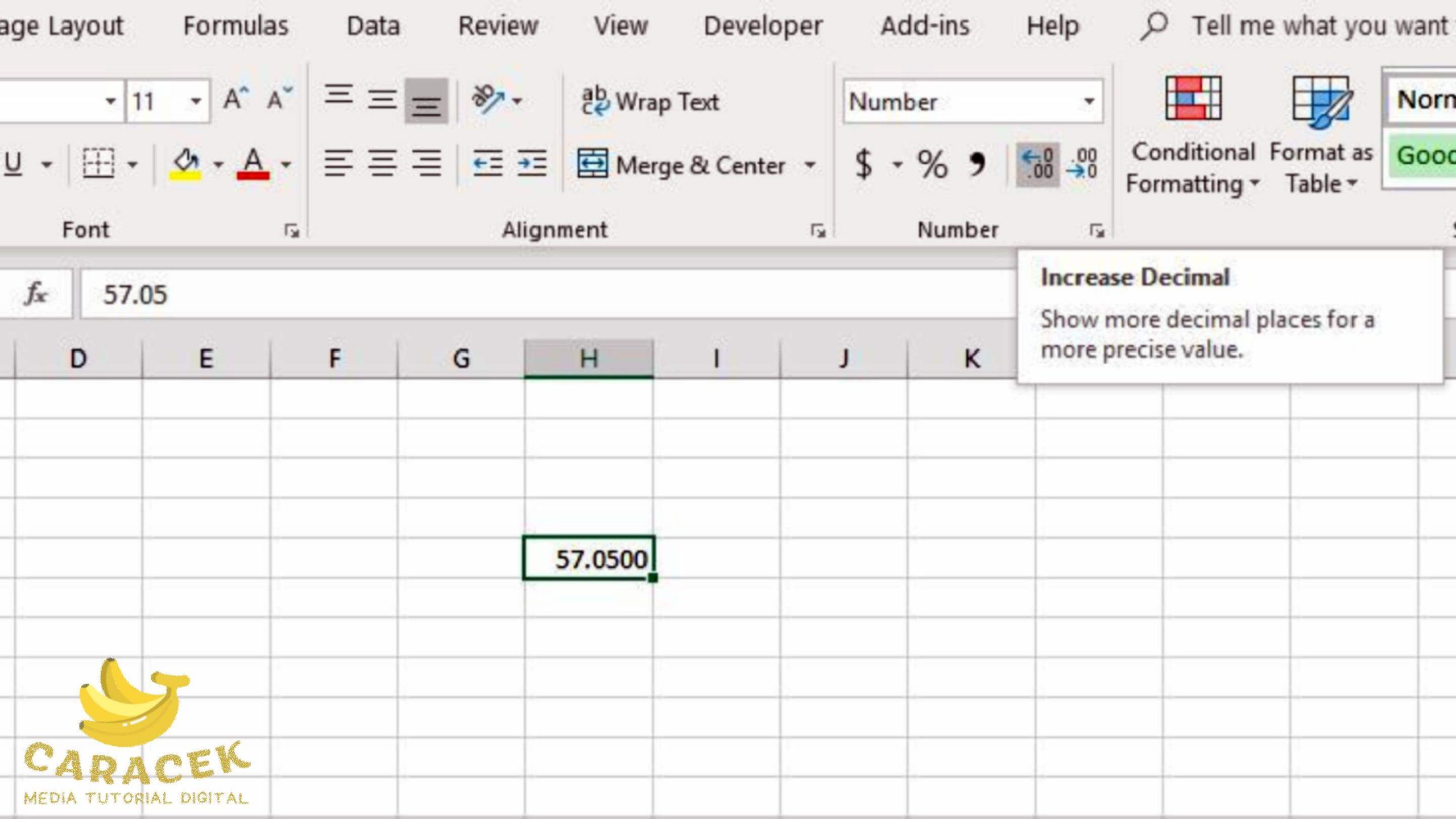 - Klik pada tombol Increase Decimal (0.00>0.000) untuk menambahkan desimal, atau klik pada Decrease Decimal(0.000>0.00) untuk mengurangi.