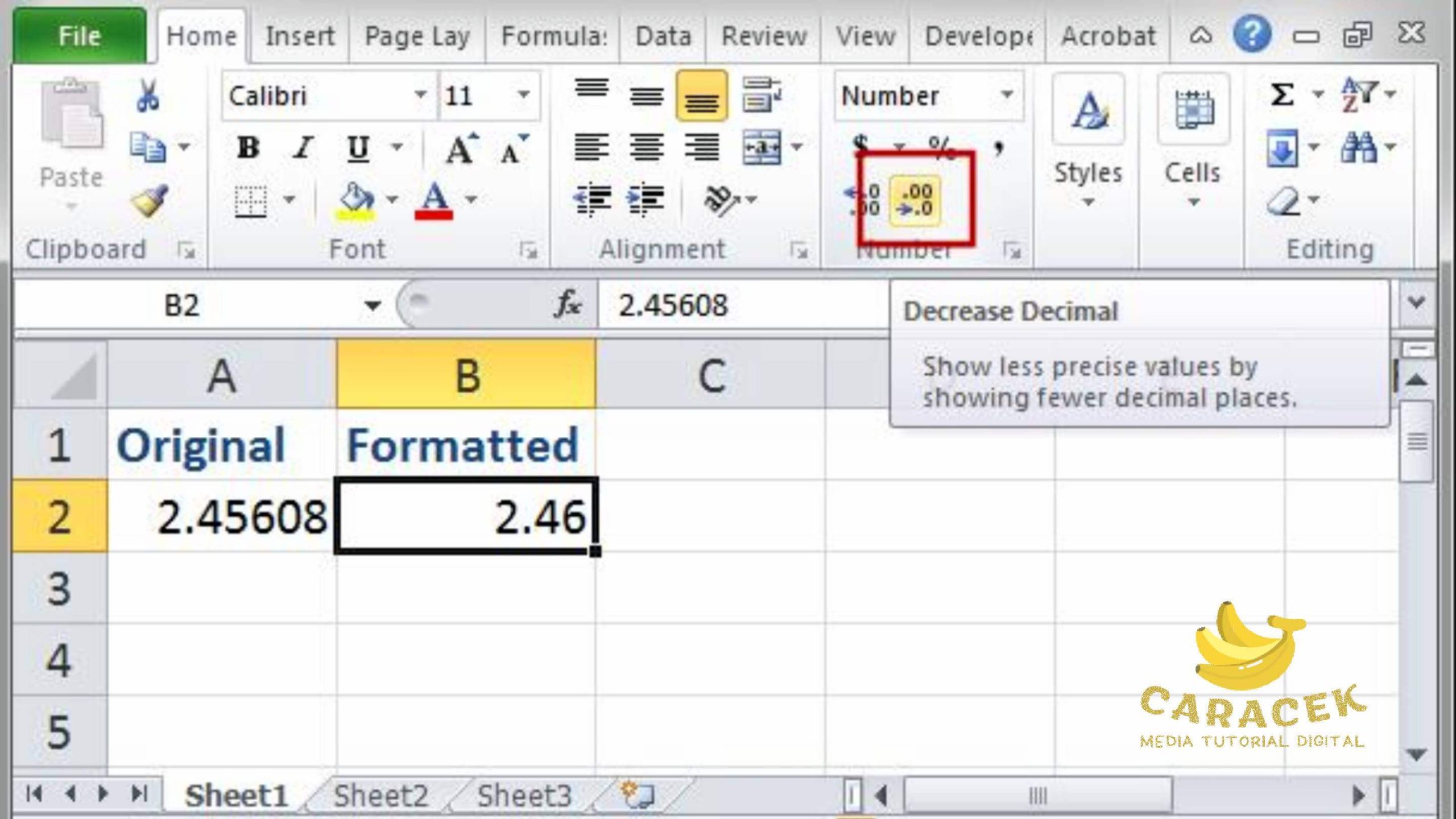 Karena tujuan Anda adalah untuk membulatkan, maka Anda bisa menggunakan tombol Decrease Decimal untuk mengurangi jumlah digit dalam sel.