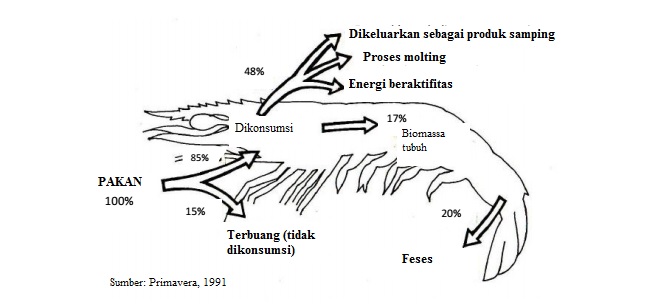 Berikut kutipan penjelasan dari Primavera (1991) menjelaskan kemana 100% pakan yang diberikan udang.